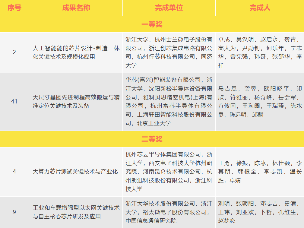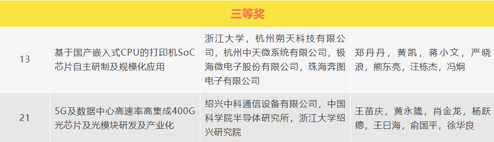 在集成电路领域,我省共有8个项目分获技术发明与科技进步奖,其中,浙江省半导体行业协会理事长单位杭州士兰微电子股份有限公司,会员单位浙江创芯集成电路有限公司、杭州行芯科技有限公司参与的“人工智能赋能的芯片设计-制造一体化关键技术及规模化应用”项目获浙江省科学技术进步一等奖;会员单位华芯(嘉兴)智能装备有限公司牵头,杭州富芯半导体有限公司参与的“大尺寸晶圆先进制程高效搬运与精准定位关键技术及装备”项目获浙江省科学技术进步一等奖;会员单位杭州芯云半导体集团有限公司牵头,杭州朗迅科技股份有限公司参与的“大算力芯片测试关键技术与产业化”项目获浙江省科学技术进步二等奖;会员单位杭州朔天科技有限公司参与的“基于国产嵌入式CPU的打印机SoC芯片自主研制及规模化应用”项目获浙江省科学技术进步三等奖;会员单位浙江大学绍兴研究院参与的“5G及数据中心高速率高集成400G光芯片及光模块研发及产业化”项目获浙江省科学技术进步三等奖。